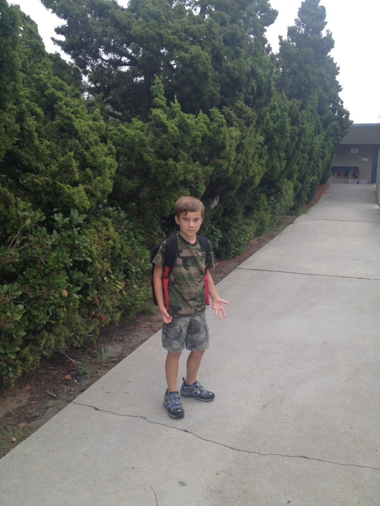 Wearing a pensive expression, her short, modern ponytails bobbing nervously on either side of her skunk-like streaked bangs, the sweet Miss X proceeded to inform me that Lex had hidden behind a bush after having been in line to return to class at recess–so essentially he lined up and then, when her back was turned to walk the kids in, he bolted for the nearest bush. This is of course an issue because of, A. Willful disobedience, B. Trickery, and, C. She had to get another teacher to watch her class while she went scouting bushes to find my recalcitrant son. In addition, although she had never seen him in her three weeks there be anything but quiet and cooperative, today he had gotten rough with another child, and for the first time refused to look at this teacher or acknowledge her presence at all.